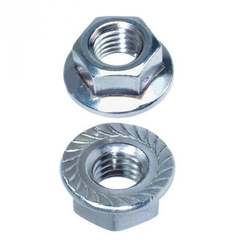 DIN 6923 Гайка шестигранная с фланцем, диаметр резьбы от М4 до М20, аналоги EN 1661, ISO 4161. Фланец гайки имеет плоскую поверхность. Для стопорения крепёжного соединения нижняя часть фланца может изготавливаться с насечками.